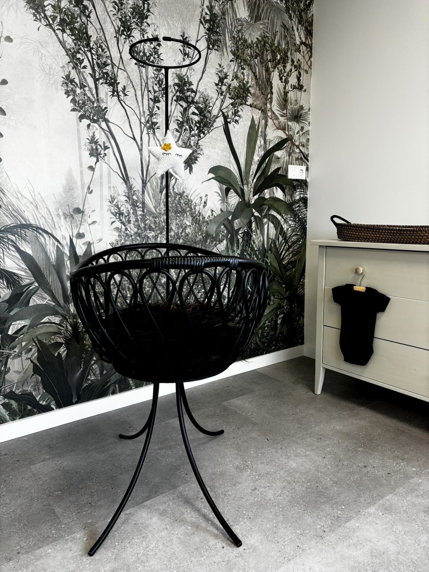 Prachtige zwarte wieg met metalen poten. Afmetingen 97x77x60 (lxhxb)